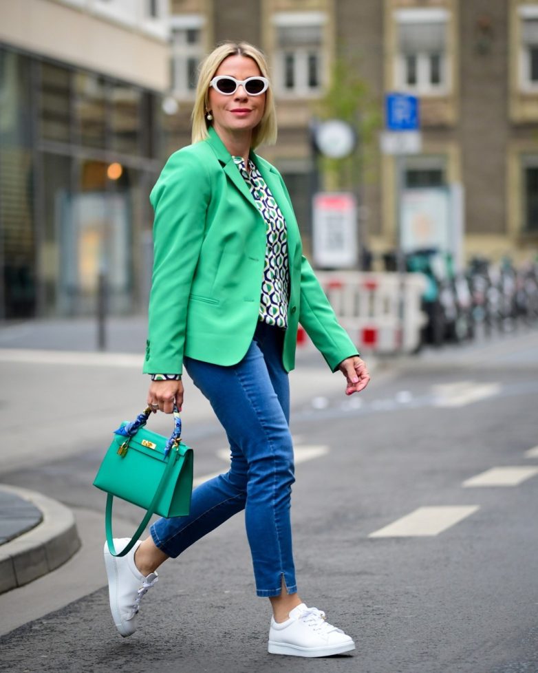 Непритязательные джинсы составят удачную компанию любому пиджаку. Для делового образа дама 40 лет выбирает классический пиджак в традиционных цветах, а для неформального ансамбля подходят пиджаки в самых ярких принтах и оттенках. Не стоит загонять себя в рамки и выбирать однообразные вещи, иногда возрастным леди полезно менять свой имидж на более креативный.