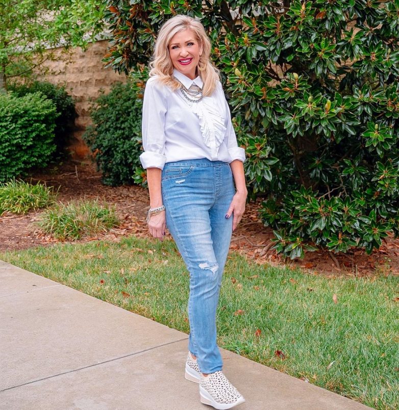 Данный стиль одежды уместно смотрится на молодежи, а женщина в возрасте выглядит в джинсах с прорехами по меньшей мере нелепо. В качестве прекрасной альтернативы можно приобрести джинсы классического стиля с высокой посадкой, минимальным декором в синем или черном цвете.