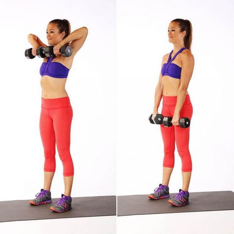 Предназначено для проработки целевых мышц. Способствует формированию мышечного рельефа области предплечий и внутренней части рук.Работаем с одной гантелью. Берём её обеими руками и поднимаем вверх. Тянем руки вверх, тело образовывает прямую линию, максимальной точкой которой должна стать гантель;