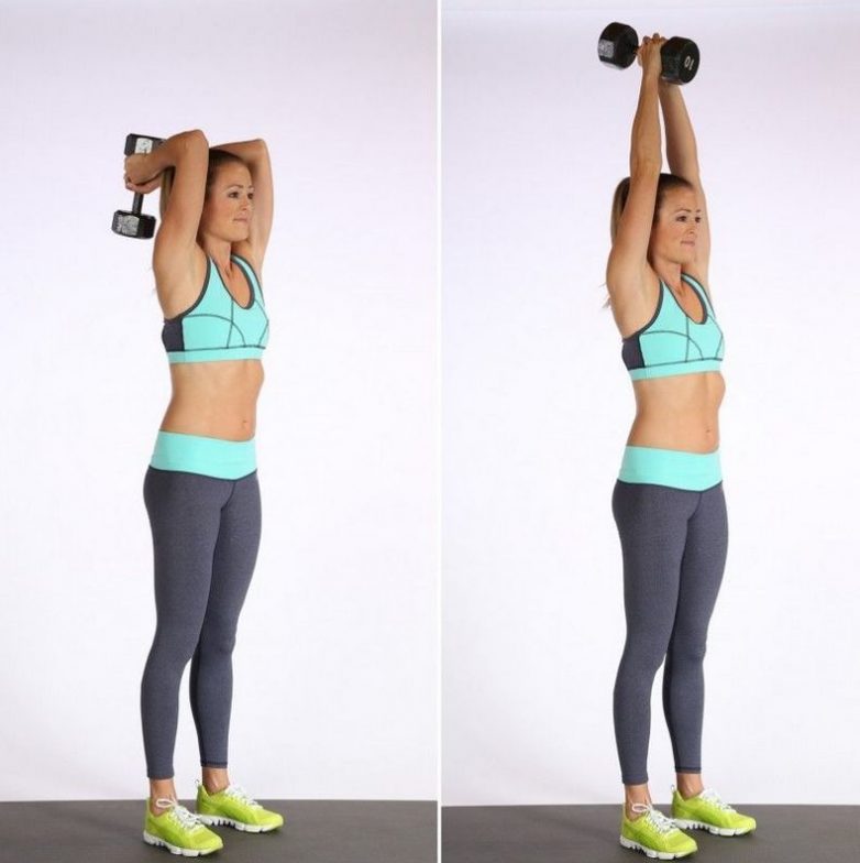 Работаем с одной гантелью. Берём её обеими руками и поднимаем вверх. Тянем руки вверх, тело образовывает прямую линию, максимальной точкой которой должна стать гантель;