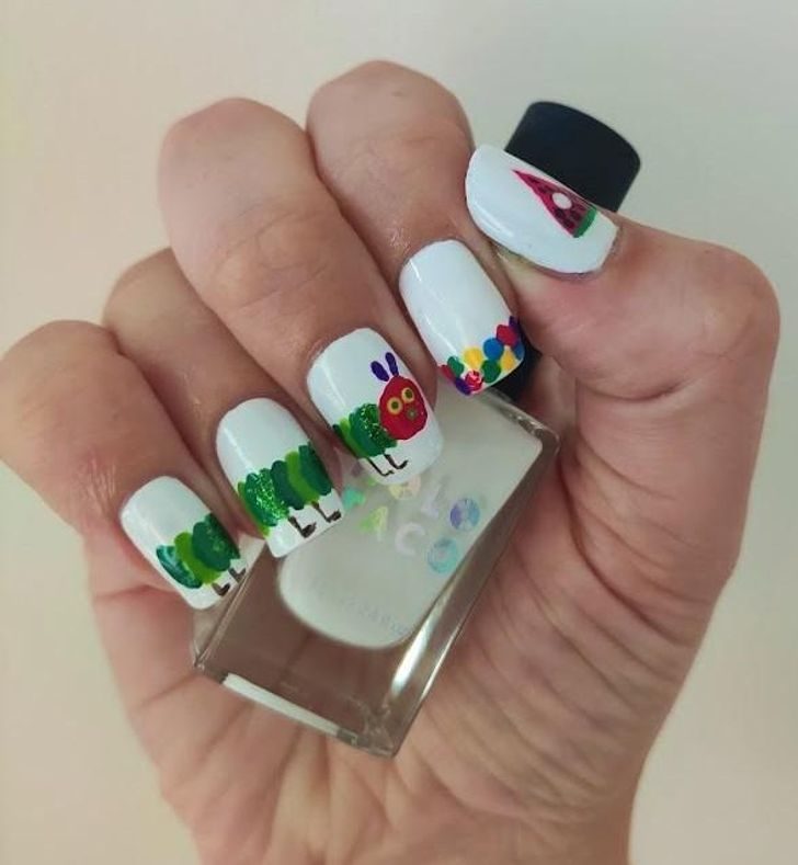 «Иду на собеседование в библиотеку, поэтому нарисовала на ногтях „Очень голодную гусеницу“»