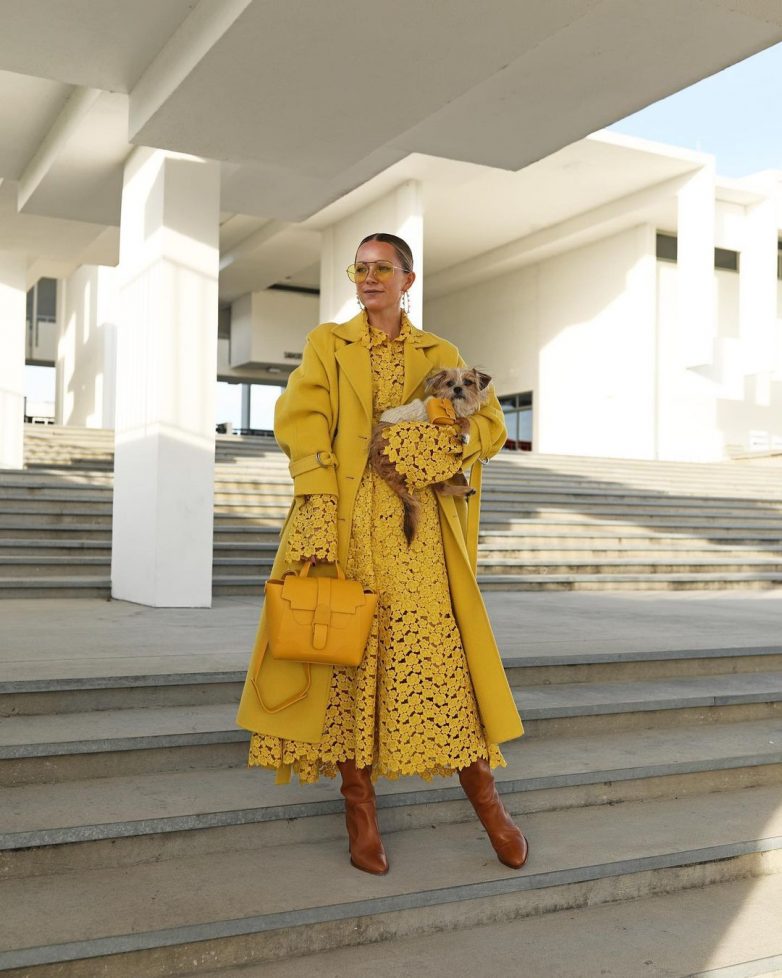 Как стильно носить кружевное желтое платье