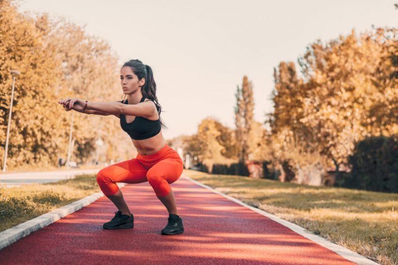 Встаньте ровно, поставьте ноги уже, чем на ширине плеч. Затем выполняйте приседания. Когда ваши бедра будут параллельны полу, поднимите пятки и пальцы ног, чтобы вернуться в исходное положение.