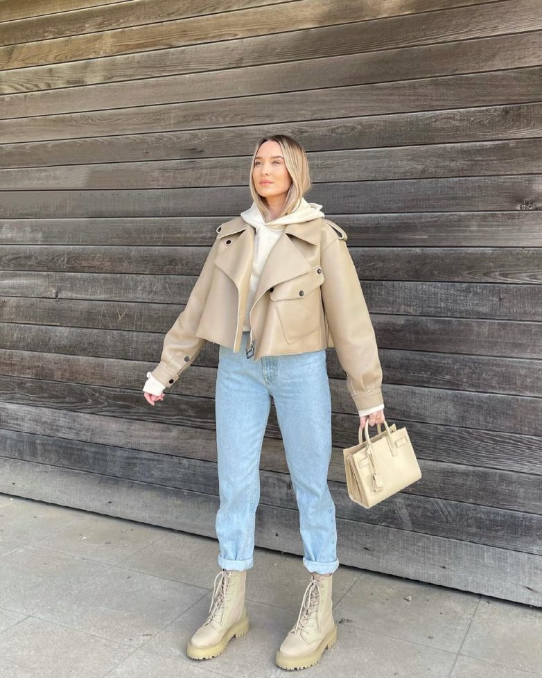 Для любительниц спорт шика стилисты выдвигают на первое место интересный ансамбль в многослойном стиле. То есть совместно с джинсами и крутой толстовкой смело надевайте пиджак. Конечно, в этом случае подходят только оверсайз стиль, иначе запихнуть утепленную толстовку просто невозможно. Пиджак выбирают в классическом бежевом и черном цвете, а также подходят модные модели в нетривиальном принте.