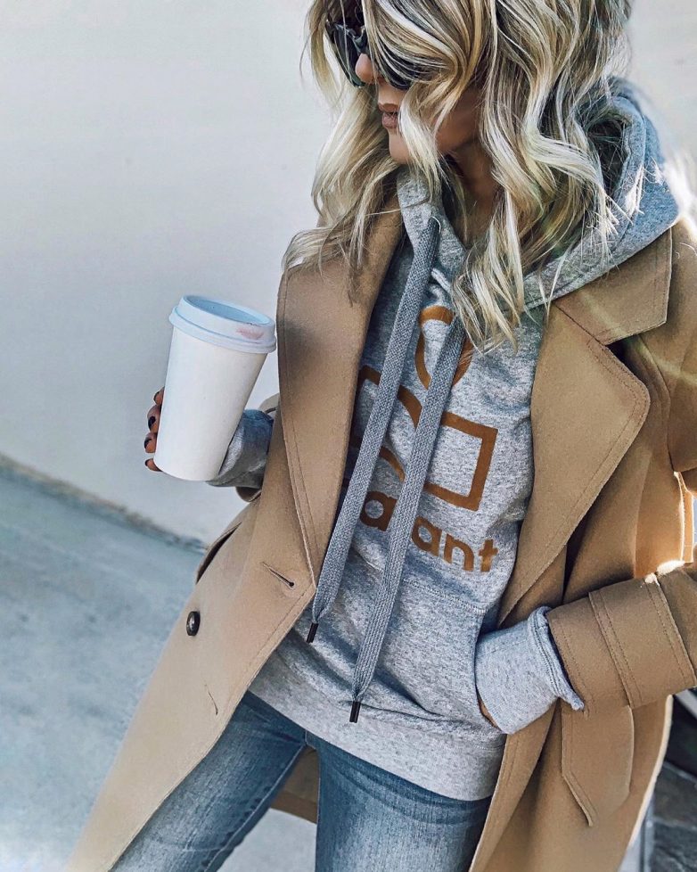 Удобный ансамбль со спортивной толстовкой и практичными джинсами можно переквалифицировать в смелый образ. Для этого вам всего лишь нужно выбрать традиционное пальто. Да, сет выглядит немного непривычно, но он полностью соответствует всем последним модным трендам. Если хочется кардинально выделиться, тогда надевайте самые грубые модели обуви.