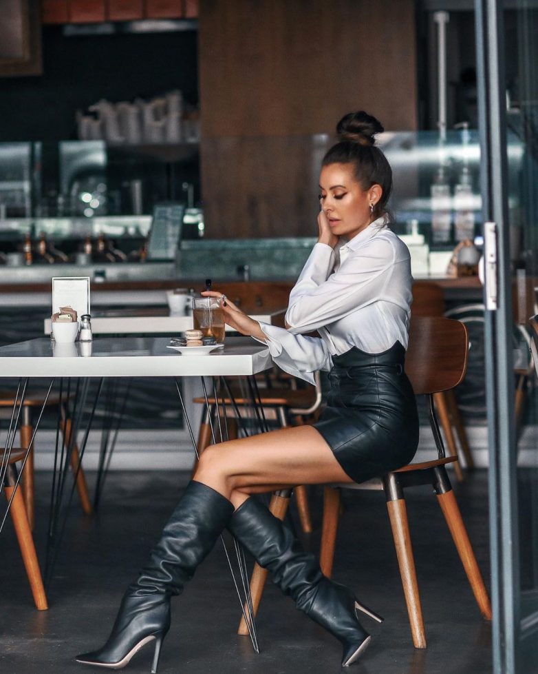 Для весеннего или осеннего образа подойдет юбка с завышенной талией из кожи или более теплого материала. Крой юбки позволит чувствовать себя комфортно, стильно и тепло. Наверх стоит выбрать классическое пальто. Очень модно выглядят луки в монохроме.