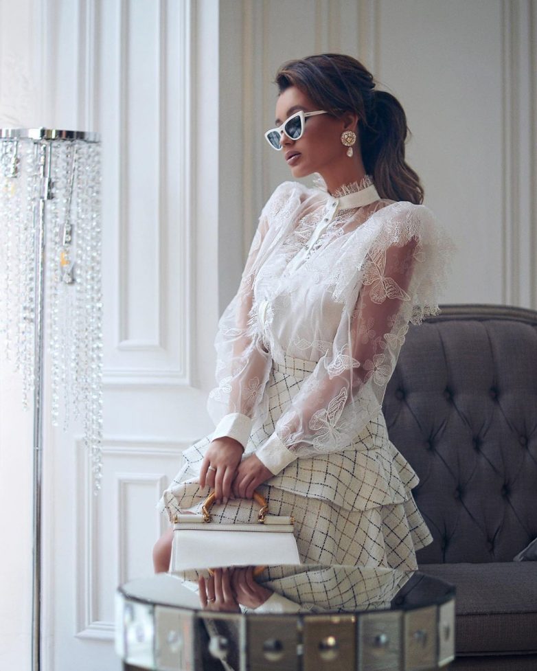 Для свидания и романтического образа можно подобрать нежную шифоновую юбку с завышенной талией длины миди и легкую блузку с прозрачными или кружевными вставками. Лук лучше собрать в спокойных и пастельных тонах, в идеале – белом или розовом.