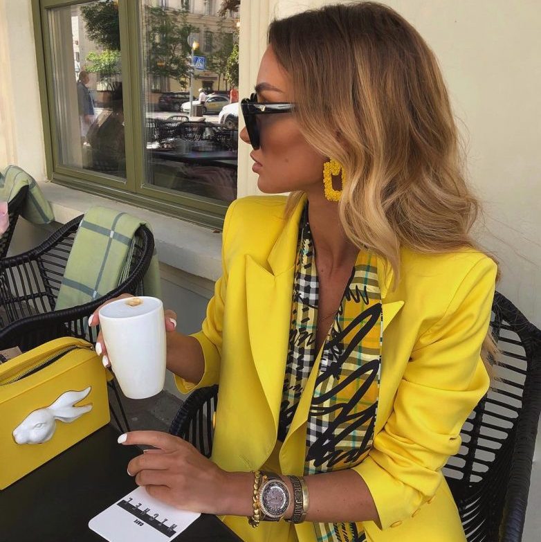 Солнечный оттенок желтого цвета считают одним из 2 главных цветов, способный озарить все пасмурные дни. Следует знать, что цвет будет доминировать в образе, сочетать его нужно со спокойными оттенками.