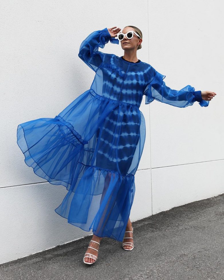 Здесь достаточно облачиться в интересное платье синего оттенка, а также изящные туфли или босоножки. Дополнить образ поможет трендовый небольшой клатч.
