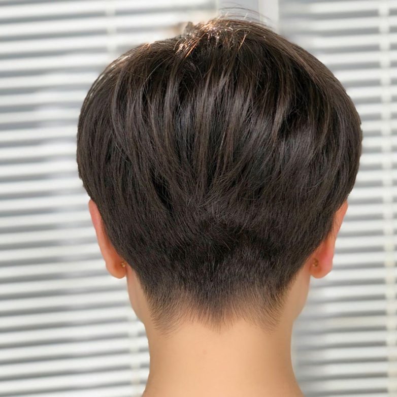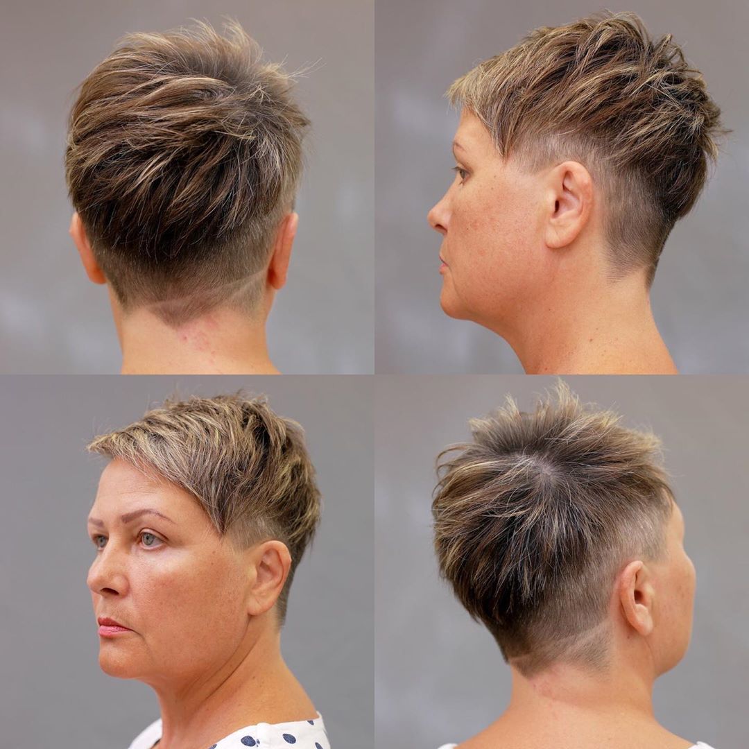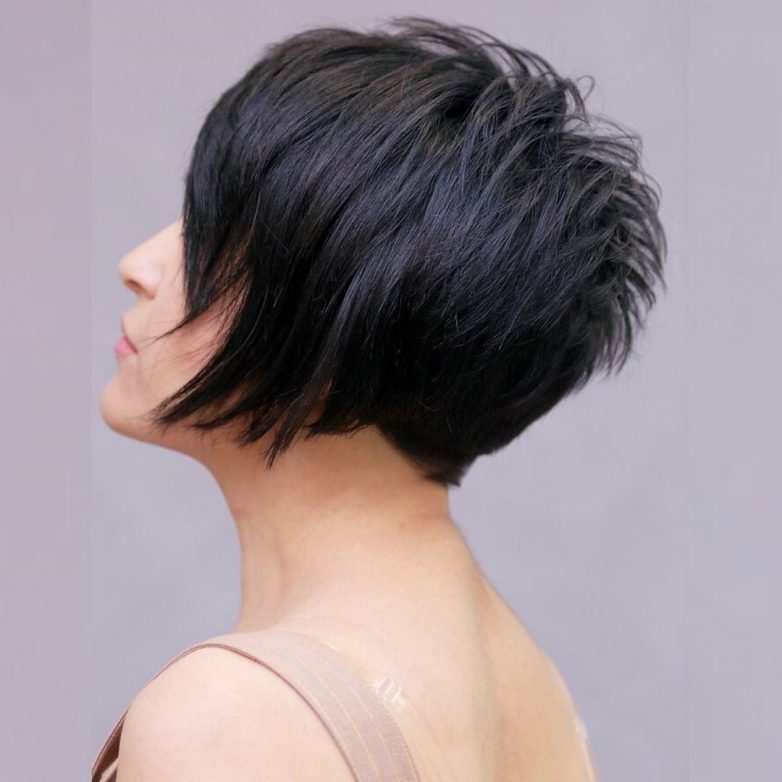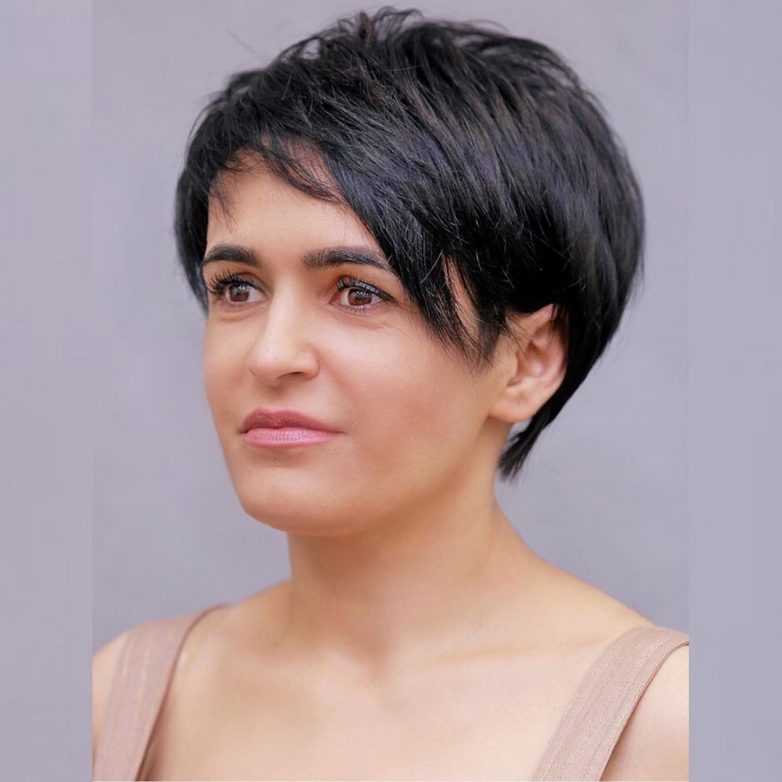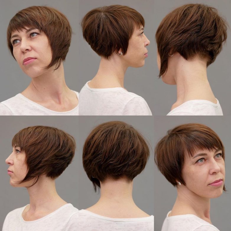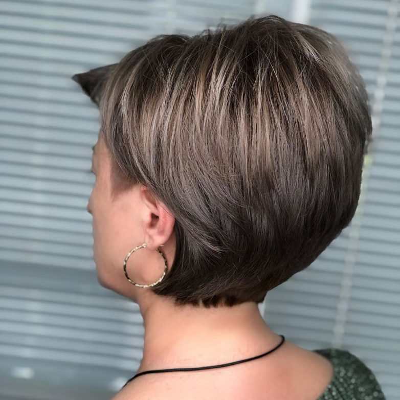 На первом месте среди коротких стрижек находится сногсшибательная пикси. Ее форма позволяет получить шикарный объем на макушке, а длинная челка сможет убрать несколько лет. Укладка пикси занимает совсем немного времени, самое главное приподнять волосы у корней. Сзади стрижка пикси выглядит дерзко, так как открывается большая часть соблазнительной шеи женщины. В 40-50 лет стрижка пикси омолодит женщину и повысит уверенность в своей красоте.