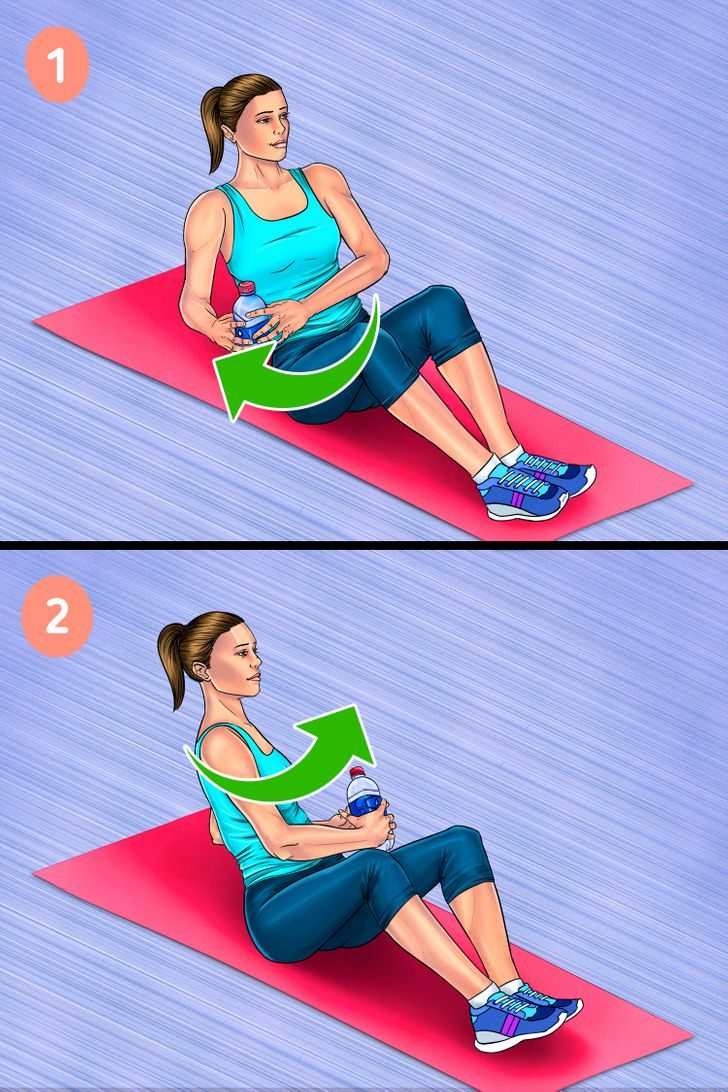 Сядьте на коврик, выпрямите туловище и слегка откиньтесь назад. Согните ноги в коленях под углом примерно 90°. Затем, держа бутылку воды в руках, повернитесь влево.