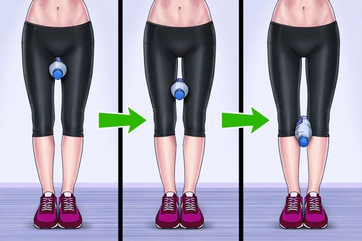 Сначала располагайте бутылку прямо под промежностью и сжимайте ее бедрами. Затем передвиньте ниже, между промежностью и коленями, и постарайтесь сдавить бедрами и коленями. Последнее положение — бутылка между колен. Сжимайте ее только коленями.