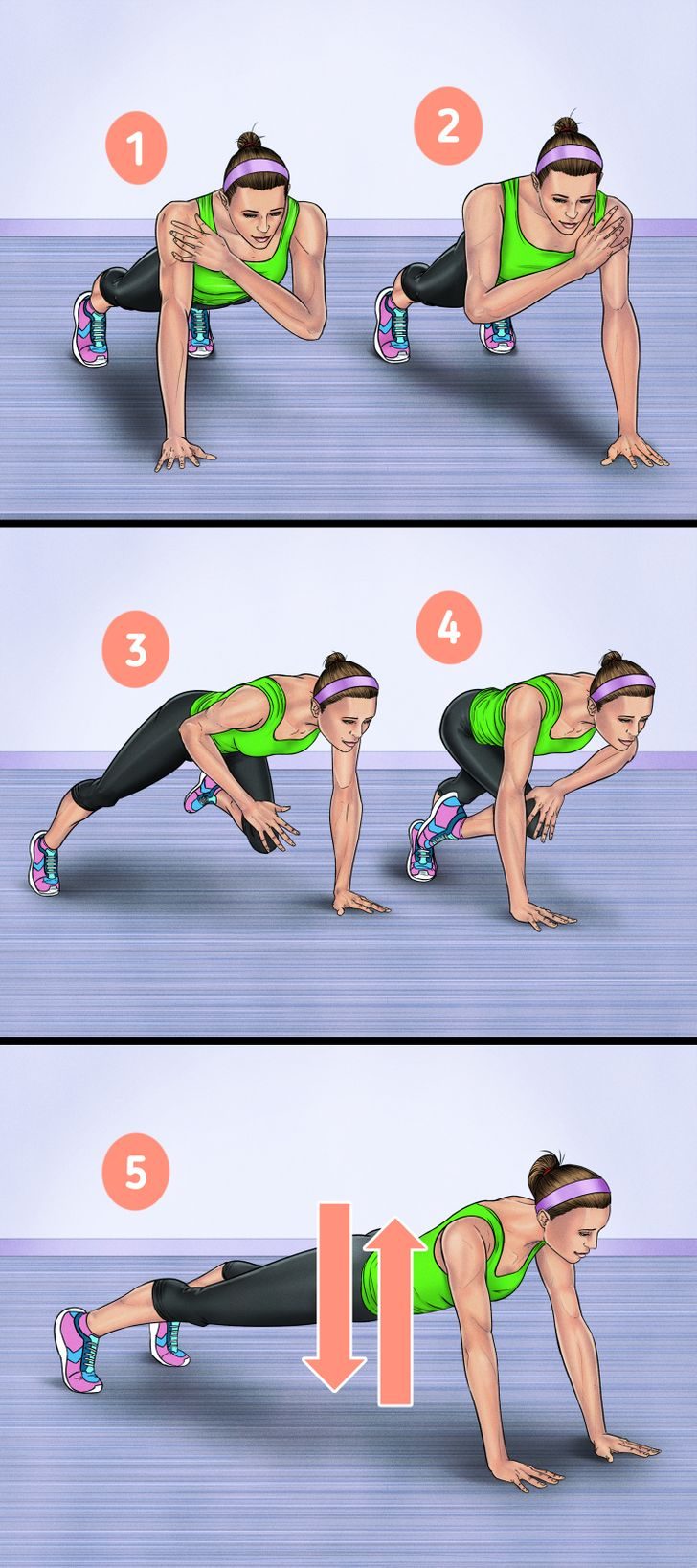 Выполните отжимание и пройдите руками в обратном направлении. Вернитесь в исходное положение.
