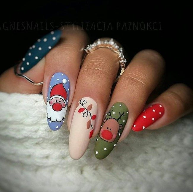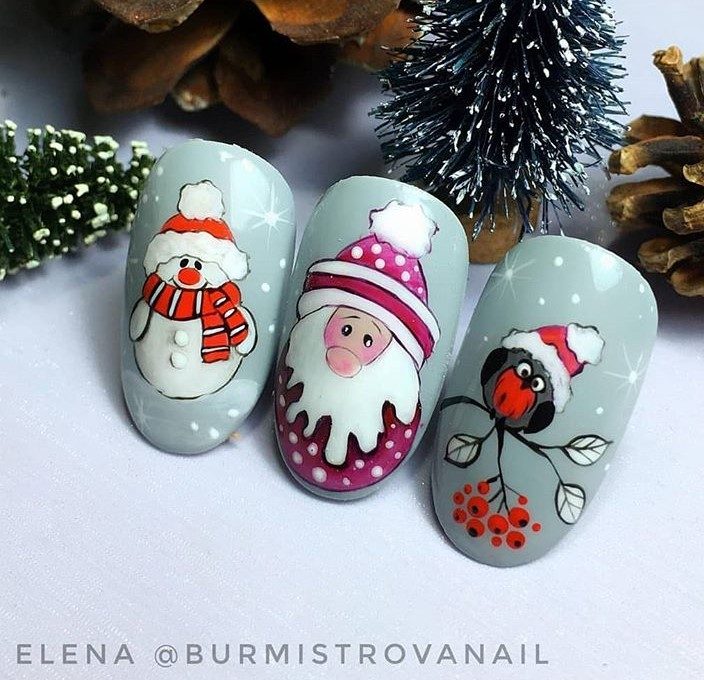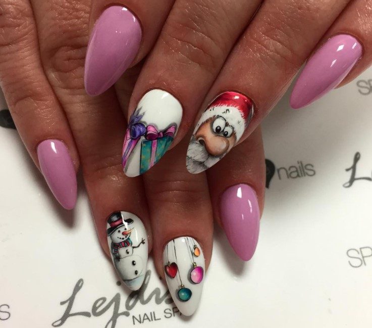 Ногти можно покрыть однотонным лаком совершенно любого цвета. На нескольких пальчиках нарисуйте добродушного Санту, а рядом расположите снеговика и елочные игрушки. Оригинально смотрится маникюр, оформленный в виде настоящего художественного рисунка.