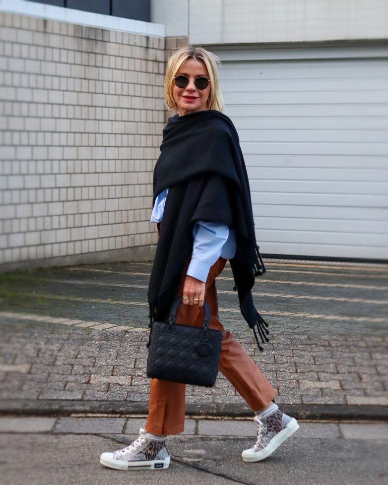 Самый теплый и милый шарфик в крупной вязке — еще одна дань стилю оверсайз. Можно найти и не слишком объемную модель, которая в базовых цветах отлично дополнит деловой образ шикарной дамы. Кстати, трендовое изделие вы вполне можете связать своими руками.
