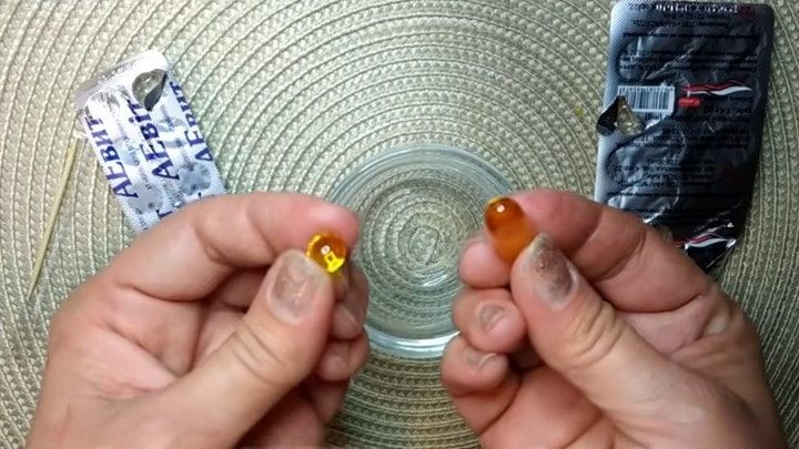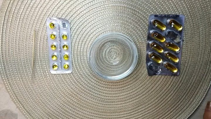 На одну процедуру потребуется одна капсула витаминов А и Е и одна капсула рыбьего жира. Почему эти средства так эффективны? В рыбьем жире есть Омега-3 кислоты и витамин D, которые очень важны для кожи, особенно если она возрастная. После 40-45 лет витамин D, по мнению многих специалистов, нужно применять для ухода за кожей едва ли не на постоянной основе, поскольку он обладает мощным антивозрастным эффектом. А о том, что витамины А и Е — это витамины красоты, слышали, наверное, все. Особенно, если они действуют в паре.