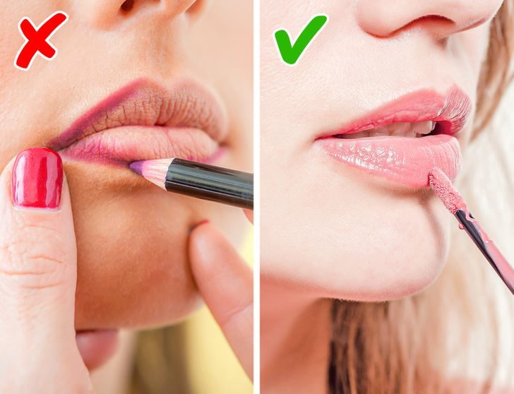 Использование темной подводки для губ, особенно в сочетании со светлым оттенком помады — сама по себе достаточно устаревшая техника макияжа, которая к тому же прибавляет возраста. Более того, темный карандаш контрастного цвета привлекает внимание к мелким морщинкам вокруг губ. Использование же карандаша, подходящего по оттенку к помаде, напротив, делает губы пухлыми и более привлекательными.