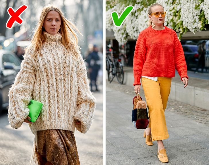 С появлением моды на объемные модели многие модницы обрадовались и решили, что теперь можно будет скрыть некоторые нюансы фигуры под мешковатыми вещами. Считается, что одежда оверсайз подчеркивает хрупкость телосложения благодаря игре на контрастах. Но проблема в том, что мешковатость крадет и все достоинства фигуры, создавая бесформенный силуэт. В итоге, переборщив с оверсайзом, можно выглядеть крупнее, чем на самом деле, независимо от вашего размера.