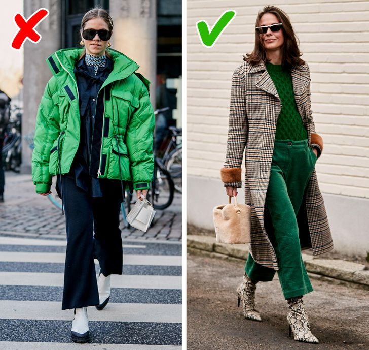 Многие любят кутаться в объемный пуховик, полагая, что он может помочь скрыть проблемные места. Однако эта вещь может создать нежелательный дополнительный объем, особенно для тех, у кого довольно широкая верхняя часть тела. Стилисты советую избегать бесформенных вещей и останавливать свой выбор на более элегантных силуэтах.