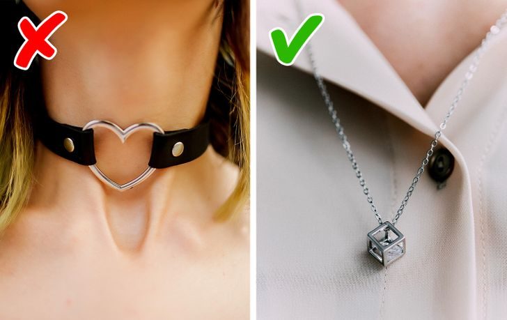 Этот броский аксессуар не только привлечет внимание к области шеи, но и визуально ее укоротит. Чтобы выглядеть стройнее и выше, лучше открыть область шеи и декольте, а не закрывать ее. Надев топ или платье с V-образным вырезом и дополнив его удлиненной цепочкой с подвеской, вы добьетесь желаемого результата.