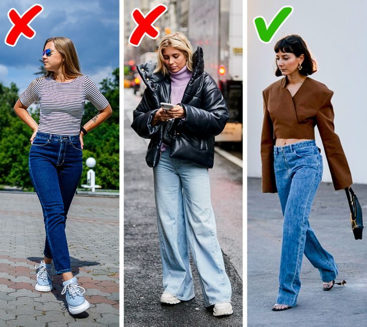 Вопреки своему названию, джинсы скинни вовсе не обязательно сделают ваши ноги стройнее. Есть большая вероятность, что они лишь подчеркнут проблемные места и визуально сделают бедра шире. В то же время мешковатые джинсы тоже могут быть не лучшим вариантом, так как в них вы рискуете выглядеть ниже и крупнее. Так что стилисты советуют обратить внимание на джинсы прямого или зауженного силуэта.