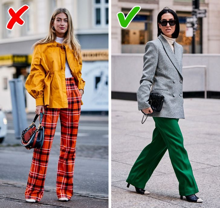 Брюки с любым принтом, исключая вещи в тонкую вертикальную полоску, прибавляют лишние сантиметры. Особенно аккуратно стоит быть с брюками в клетку. По мнению экспертов, в них даже худенькая женщина будет казаться более полной. А вот однотонные штаны темных оттенков, наоборот, сделают фигуру стройнее.
