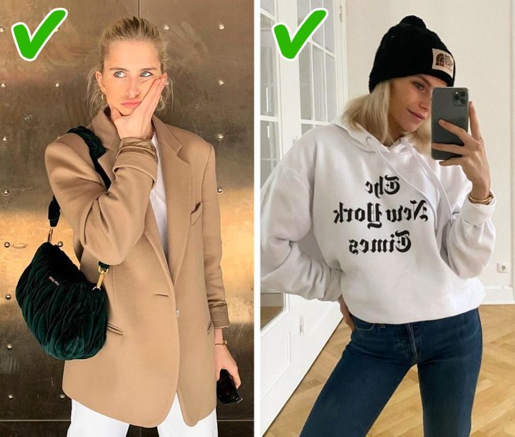 Не стоит покупать безумно необъятную одежду. Все должно быть адекватно вашему росту и формам. Главная иллюзия в том, что на самом деле обтягивающие вещи создают больший объем, чем вещи оверсайз! Особенно если хотите скрыть несовершенства фигуры.