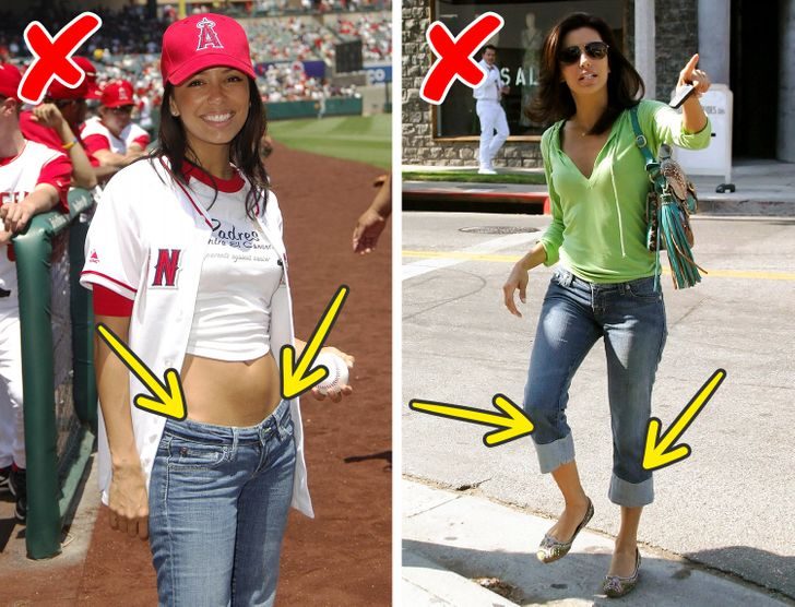 Не стоит надевать обтягивающий верх с обтягивающими штанами или натягивать его поверх брюк с защипами. Это полнит и выглядит скучно.