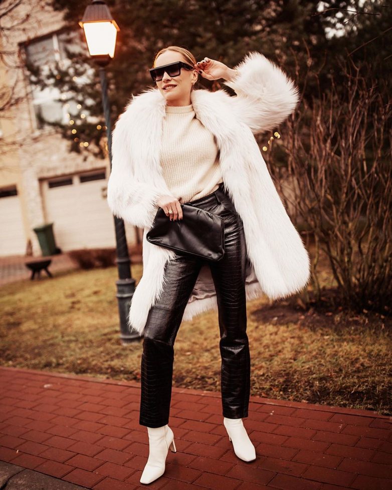 Шикарно смотрится женщина, облаченная в коротенькую белоснежную шубку. Придаст образу элегантности высокий каблук. Ноги визуально вытянутся, становясь еще стройнее, фигура преобразится.