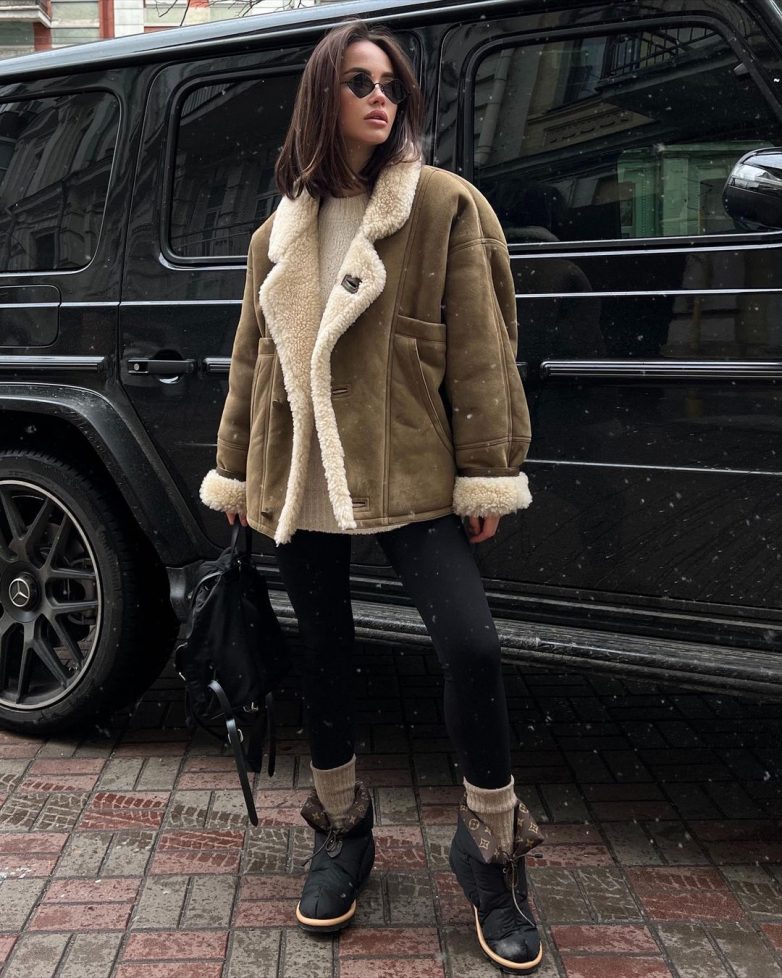 Дубленку считают универсальным и очень теплым изделием, с которым можно собирать повседневные образы на каждый день зимы. Кожаные брюки, широкие модели, удобные джинсы – к дубленке подходит практически все. Обувь, кстати, тоже может быть как на платформе и в грубом формате, так и элегантная на каблуке.