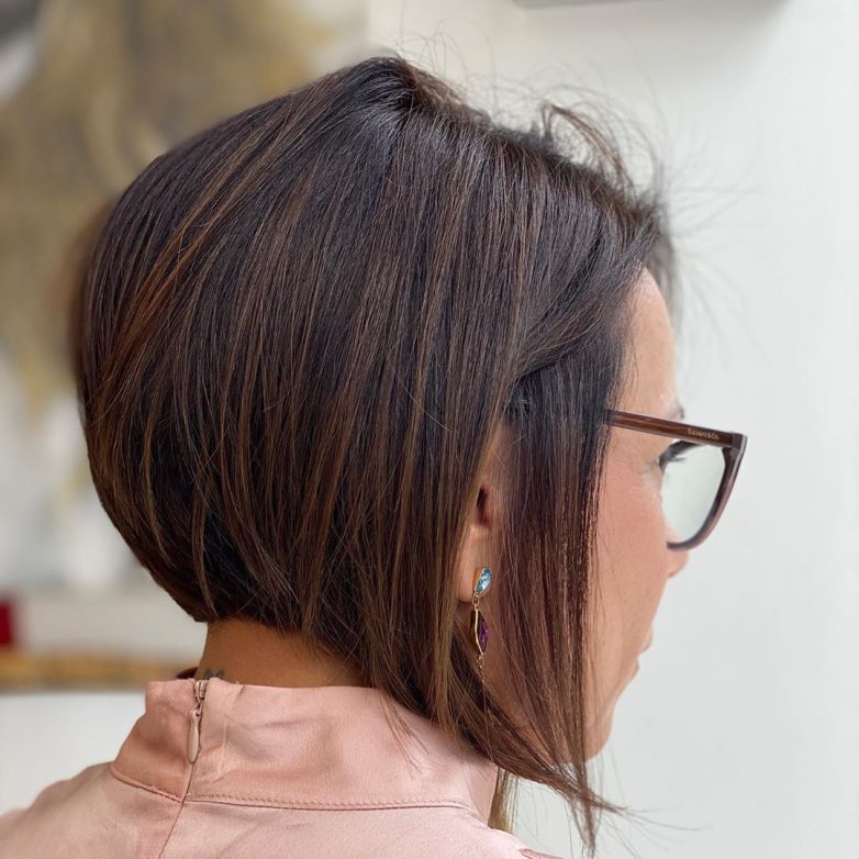 Боб-каре с косой челкой – идеальная прическа для женщин в зрелом возрасте, так как челка скрывает возрастные изменения;