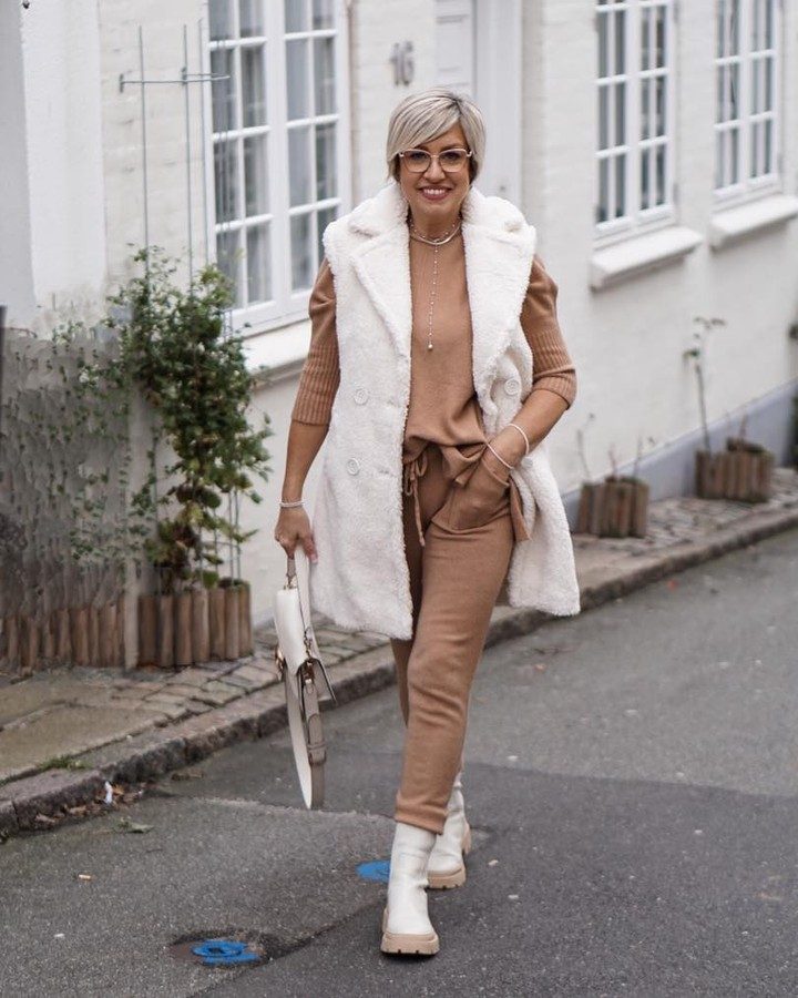 Брючный костюм – это неизменная классика, которая всегда должна быть в гардеробе современной дамы 40 лет. Цвет комплекта может быть любой: темный, черный, пастельный, но если вам хочется выглядеть настоящей иконой стиля, тогда выбирайте шикарный белоснежный брючный костюм. Причем подходят не только традиционные брюки, но и модные в 2022 году палаццо. В таком образе вы будете выглядеть гораздо моложе своих лет.