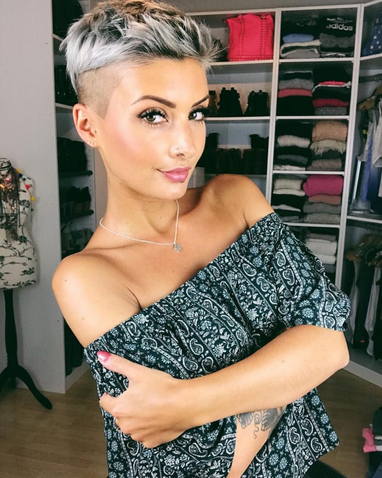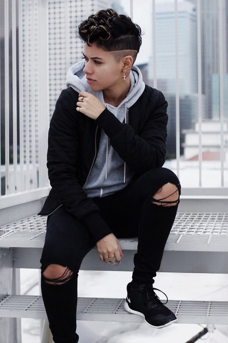 Может быть выбрит только один висок, тогда волосы зачесываются на одну сторону. На виске может быть выстрижен рисунок или набита татуировка, все зависит от смелости обладательницы прически.