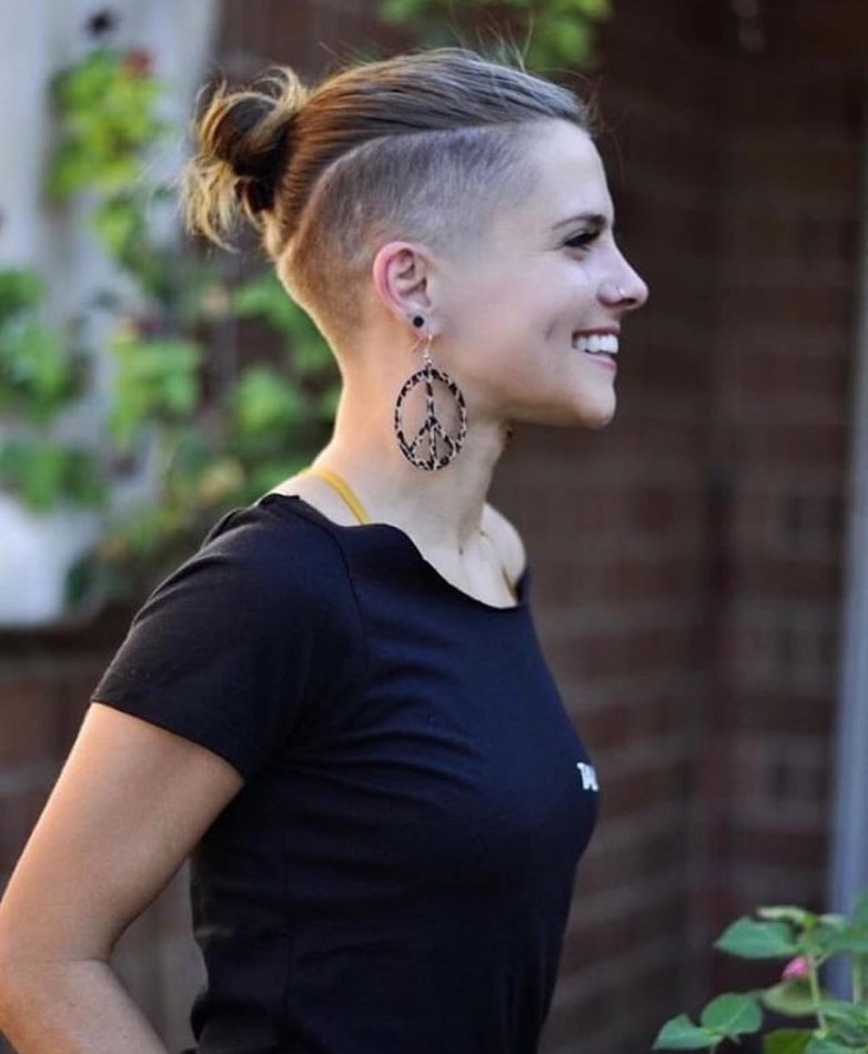 Для такой прически необходимо оставить волосы только на макушке и выбрить их на висках и затылке. Часто можно встретить девушек, которые выполняют различные орнаменты не на висках, а именно на затылке. Который будет видно, когда волосы собраны в пучок.