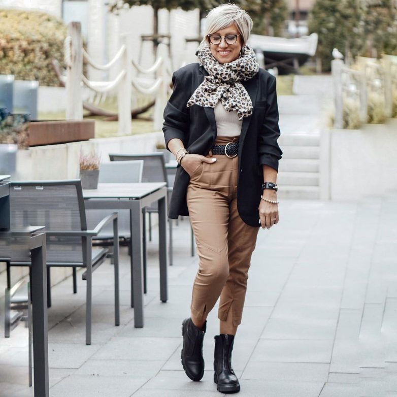 Деловой или уличный стиль с пиджаком выглядит куда более стильно, если на шею повязать модный шарф. Желательно шарф выделить в образе, поэтому выбирайте объемные модели, с хищным или красочным принтом. Не нужно слишком строго относиться к шарфу, пусть он совершенно не подходит к палитре образа, а выступает нетривиальным элементом, который подчеркивает ваш цвет глаз, волос или привлекательный аксессуар.