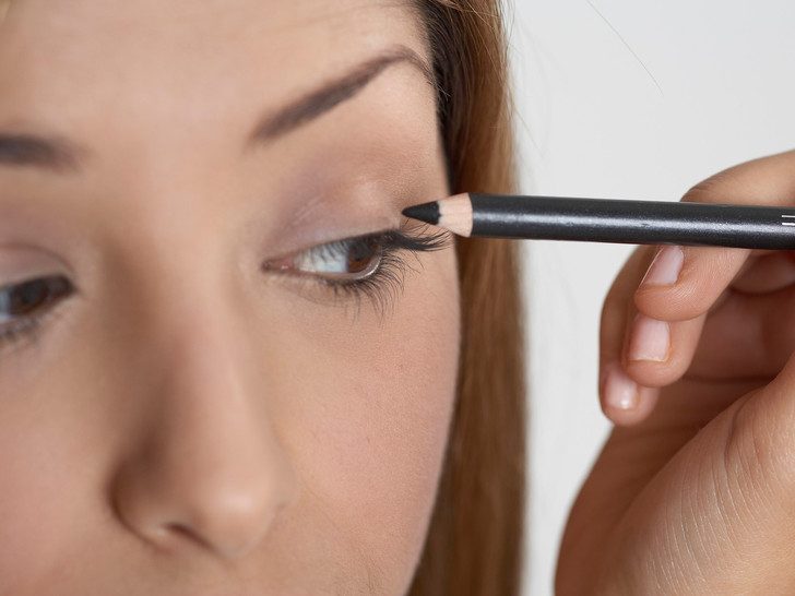 Стрелка должна утолщаться примерно от середины века и выходить за внешний угол глаза. В дополнение можно воспользоваться белым или светло-бежевым карандашом, чтобы подчеркнуть нижнее веко по линии роста ресниц, а также внешние и внутренние уголки глаз. Это придаст взору необходимую открытость. Если нет карандаша, подчеркните внутренние уголки глаз белыми или светло-бежевыми тенями.