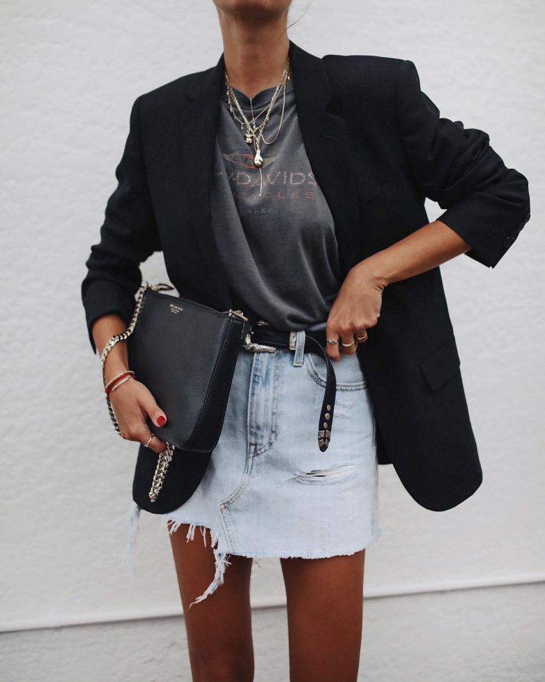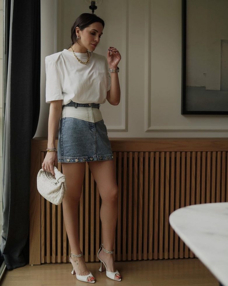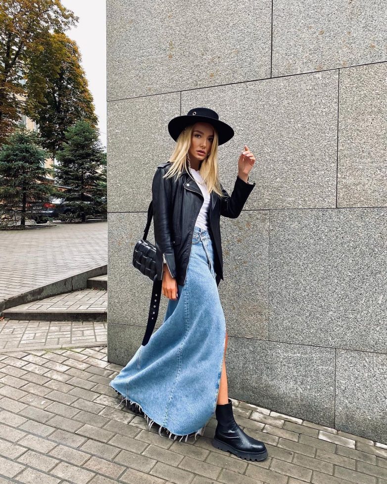 Дизайнеры создали много изделий с ассиметричным кроем. Джинсовые юбки прекрасно сочетаются с блузами из шифона, кружевными топами или кожаными жакетами. Главное ‒ правильно подобрать свой размер. В 2022 году из моды потихоньку выходит уютный оверсайз, поэтому следует сосредоточиться на облегающих фигуру вещах.
