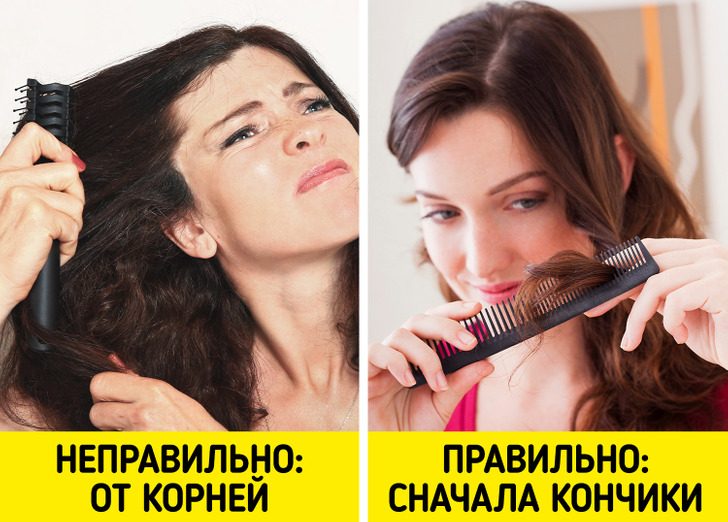 Самое важное: начинайте с кончиков, а не с корней, и постепенно поднимайтесь вверх. Если вы обладатель длинных густых волос, которые часто путаются, или кудряшек, то не стоит пренебрегать спреем для расчесывания — он поможет распутать узелки. Во время распутывания старайтесь не тянуть за корень волоса. И разумеется, расческа должна быть максимально чистой.