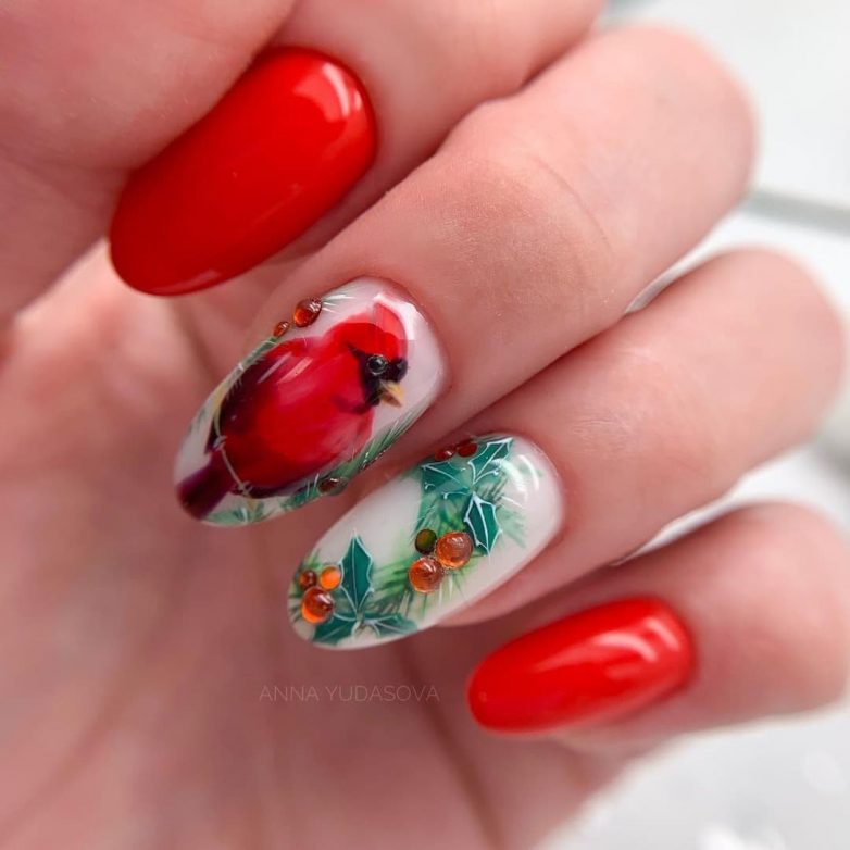 Круглый маникюр выбирают дамы с легким характером и стильным вкусом. Дизайн для этой формы можно выбрать совершенно любой начиная с лаконичного нюда, заканчивая насыщенными узорами и яркими красками в зимней тематике.