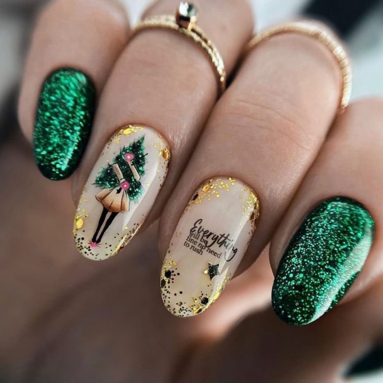 Для создания праздничного дизайна стоит в круглый маникюр добавить чуть больше блестящих вставок. В 2022 году более актуальны различные камифубики и разноцветный глиттер. Если вы хотите выделить свой яркий образ, тогда покрывайте все ногти блестками. Для других модниц предлагают более сдержанные варианты, в которых сияние остается только на одном ногте.
