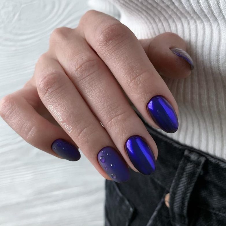 Синяя палитра – это актуальный цвет зимы в 2022 году. Все дело в водяном тигре, который будет символом следующего года. Круглый маникюр в глубоком тоне смотрится еще эффектнее. Всегда можно выбрать однотонный дизайн с полным исключением вставок, но более креативные дамы сделают красивый френч с синей улыбкой, украсят ногти зимними узорами или разнообразят дизайн блестками.