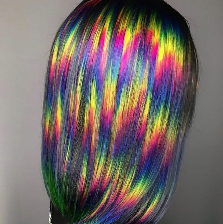 Если вы позитивная, яркая дама, значит, этот тренд в мире окрашивания вас точно очень сильно порадует. Радужное безумие на волосах – это все оттенки, которые можно только представить. Окрашивание занимает много времени и сил, но выглядит невероятно эффектно. Если полностью краситься в радугу вы не желаете, можно попробовать вариант скрытого окрашивания, которое отлично подходит брюнеткам и шатенкам. Также с радужными прядями можно делать все современные техники с переходами оттенков.