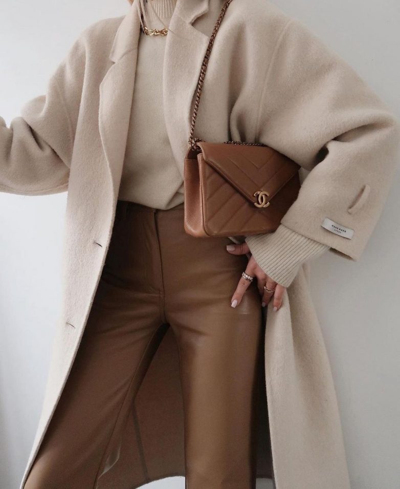 В образ бизнес-леди гармонично смотрятся любые кожаные детали. Если вам нужен солидный сет, но в то же время он должен подчеркивать привлекательную фигуру, тогда обратите внимание на кожаные облегающие брюки в черном или коричневом цвете. Совместно с мягким кардиганом или свитером и классическим пальто такая экстравагантная деталь не испортит ваш деловой имидж на зиму.