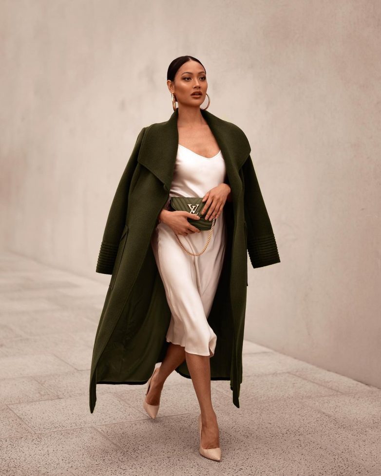 Бельевой стиль сможет выразить вашу соблазнительную натуру. Для создания идеального сета в холодную погоду можно сверху накинуть классическое пальто, а из обуви выбрать лодочки или ботильоны.