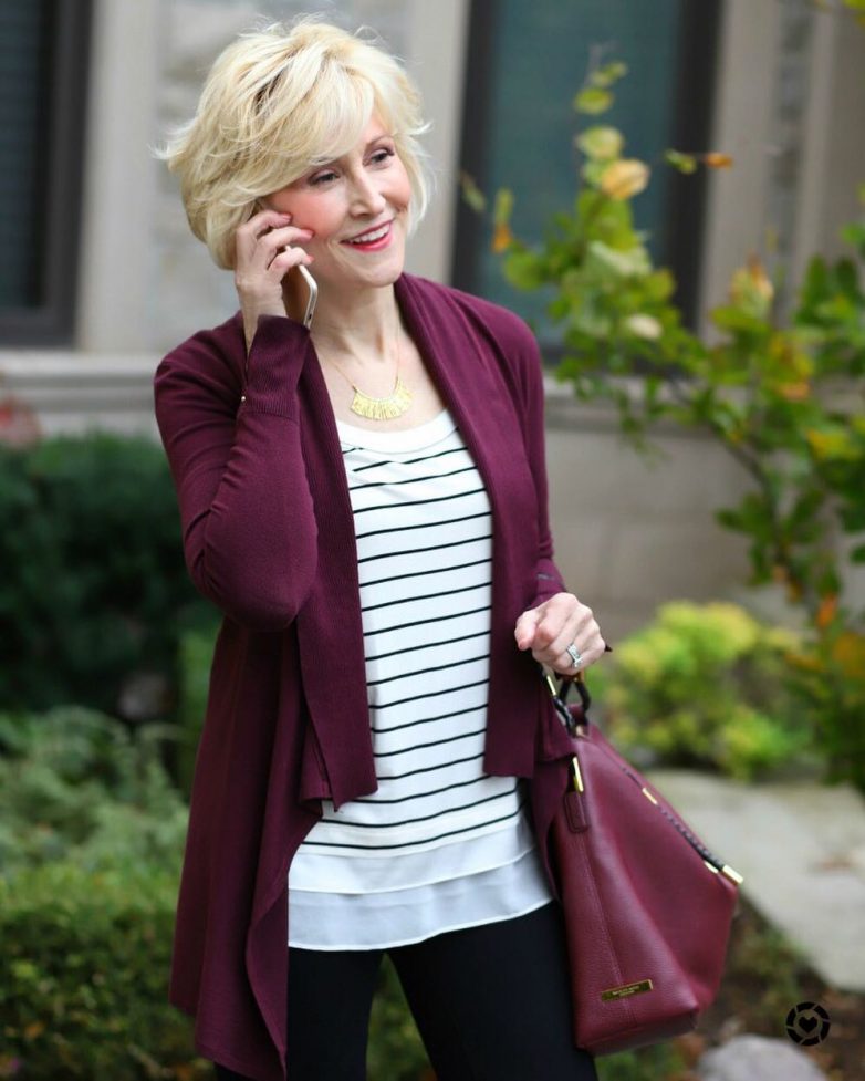 Не стоит носить длинные юбки, которые делают фигуру возрастной женщины неуклюжей. Отличной длиной всегда считалась длина чуть ниже колен. А если вы обладательница стройных ножек, то можно надевать юбки длиною несколько выше колен.3. Оставьте дома свой кардиган