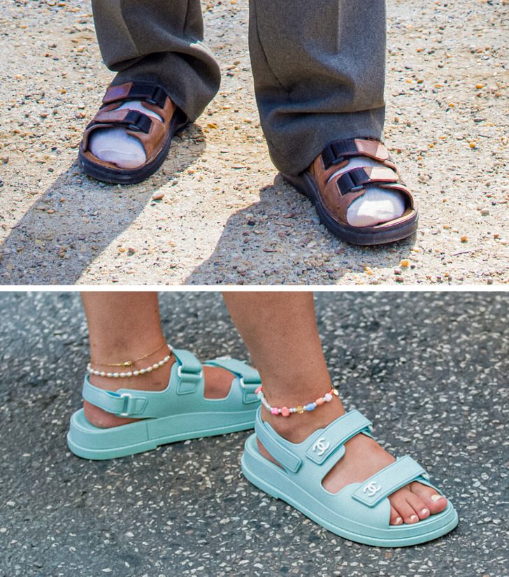 Девушки продолжают заимствовать вещи из мужского гардероба. На очереди «дедушкины» сандалии, которые порой еще называют рыбацкими. Они получили репутацию обуви для пожилых людей из-за своей массивности и удобства. Стилисты советуют оставить все предрассудки в прошлом и спокойно носить сандалии в сочетании с летним костюмом и браслетом на ноге. Многие так и сделали, и неспроста массивные сандалии стали трендом.