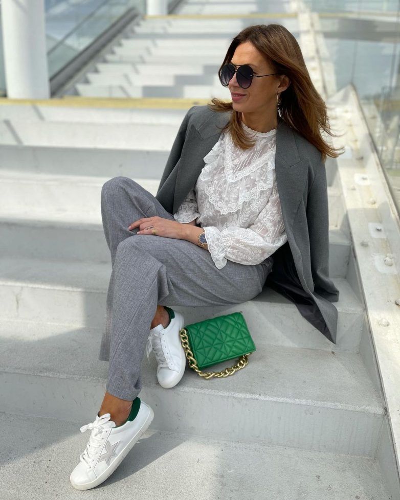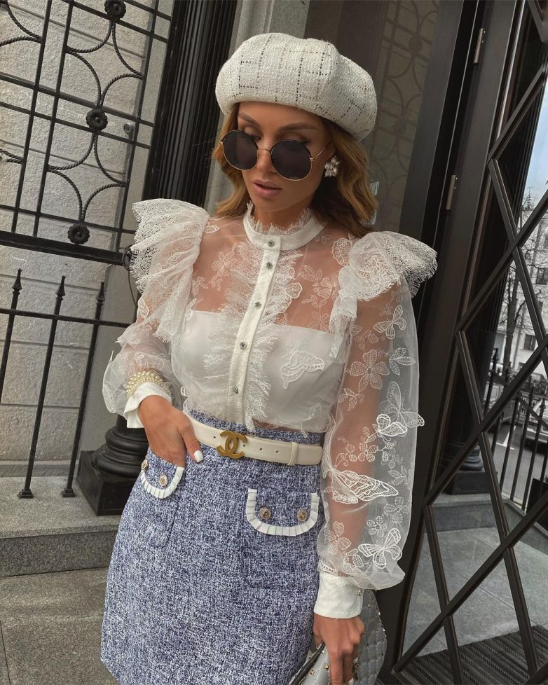 Белая блузка из кружевного полотна станет отличным дополнением к брючному костюму, зауженной юбке, белым джинсам на высокой посадке. Такие блузки носят заправленными вовнутрь. Выглядят они нарядно, однако выдержат даже самый строгий дресс-код.