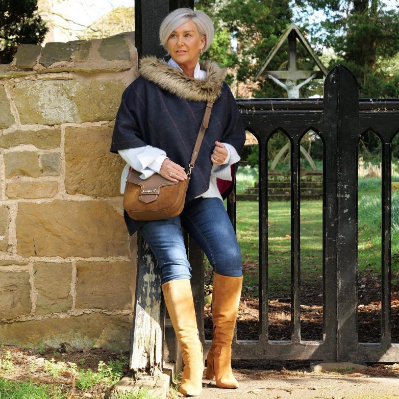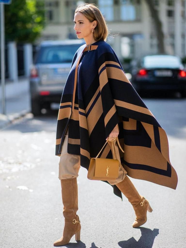 Пончо – это отличная альтернатива пальто, более того, с этой вещью вы будете выглядеть еще привлекательнее и интереснее. Пончо носят с любой обувью, запретов здесь нет. Поэтому осенью вы можете легко собрать изящный образ с высокими сапогами. В этом случае можно надеть короткое платье или юбку, также подходят джинсы или брюки, которые аккуратно заправлены в сапоги. Смелые ботфорты на грубой подошве или милые сапожки на каблуке – любая модель обуви дополнит стильный образ дамы с пончо.