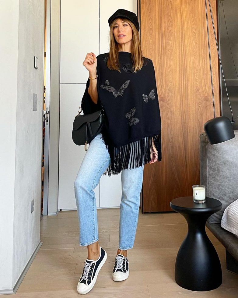 Пончо вам пригодится не только для офисных и романтичных ансамблей. С этой теплой и уютной вещью вы можете отправиться на прогулку или пойти на пикник с друзьями. Здесь дамы выбирают к пончо комфортные кроссовки или милые кеды. Одинаково хорошо в таком образе смотрятся джинсы и свободные брюки. Можно даже немного подвернуть брюки, чтобы увеличить привлекательность легкого образа.
