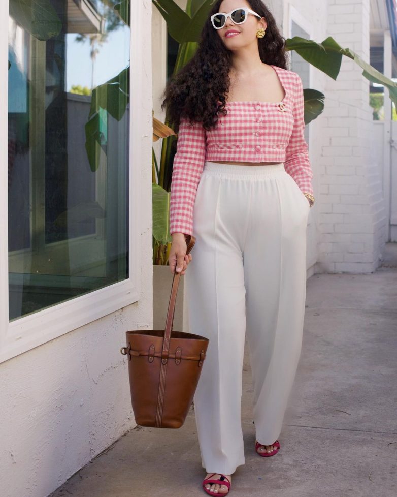 Высокая посадка бананов позволит женщинам не только ощущать комфорт, но и придать фигуре четкие очертания, подчеркнуть талию. Верхняя часть брюк должна слегка облагать животик, скрывая его. Если верх будет объемным, то он визуально сделает женщину еще полнее. Так что в области живота никаких драпировок.